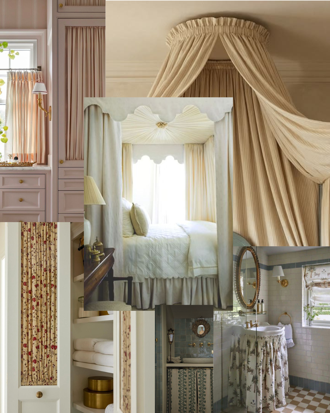 Canopies. Fabric-lined cabinetry. Skirted storage.